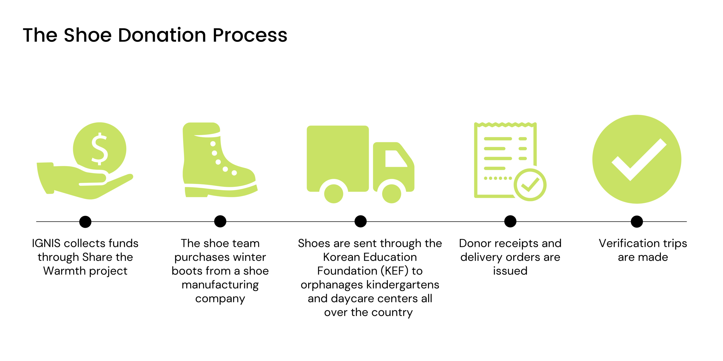 IGNIS Community’s Shoe Donation project (Share the Warmth) started in 2009 with the purpose of sharing a “warm” gift to the children in North Korea. Winter boots are a necessity as temperatures during the winter season can reach as cold as -30° Celsius (-22° Fahrenheit).